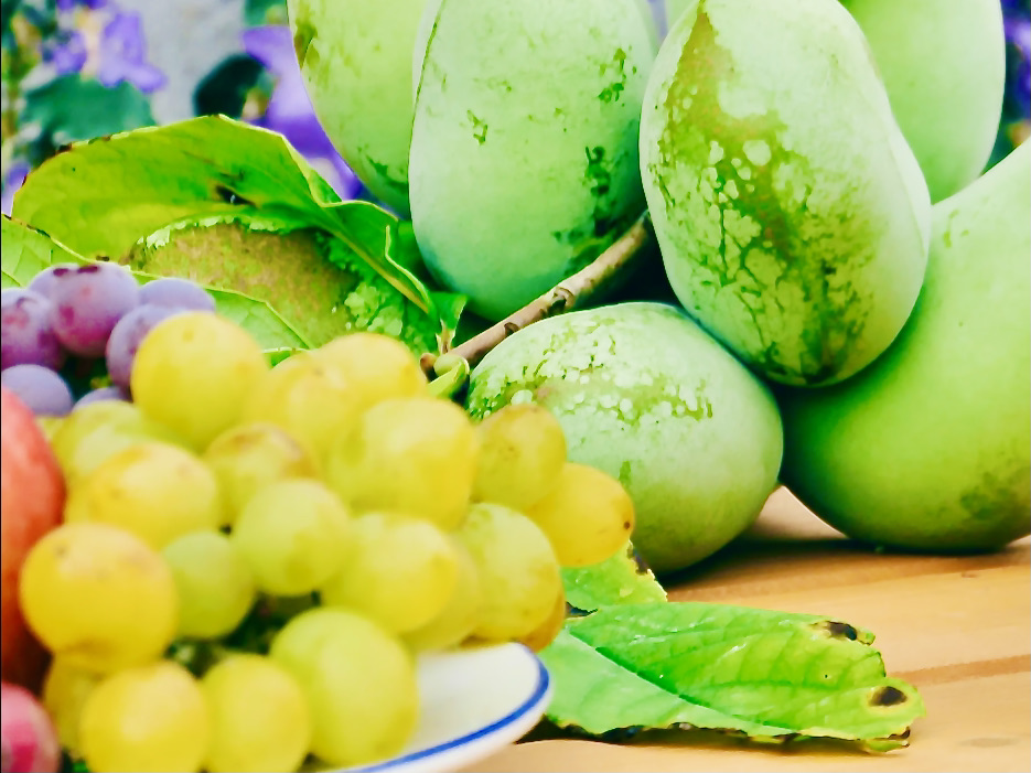 Pawpaws (Indianer-Banane), Mandeln, die Baumhasel, die Herznuss, die Zaubernuss, Orangenkirschen, Szechuan-Brombeeren, Granatäpfel, Zwerg-Tamarillos, Maroni, Wacholder, Schneebirnen oder Weißdorn – um nur Einige zu nennen. Sie tragen saftige Früchte und sattduftendes Laub. Vom Feld kommen von Amaranth, Andorn, Bergamotte, Tabak, Erdbeerspinat, schwarzer Tortilla-Mais, Eisbeeren, Zuckerwurzel bis zum grünen Hokaido Dutzendschaften dazu, die hier aufgezogen, ja gehetscherlt werden.