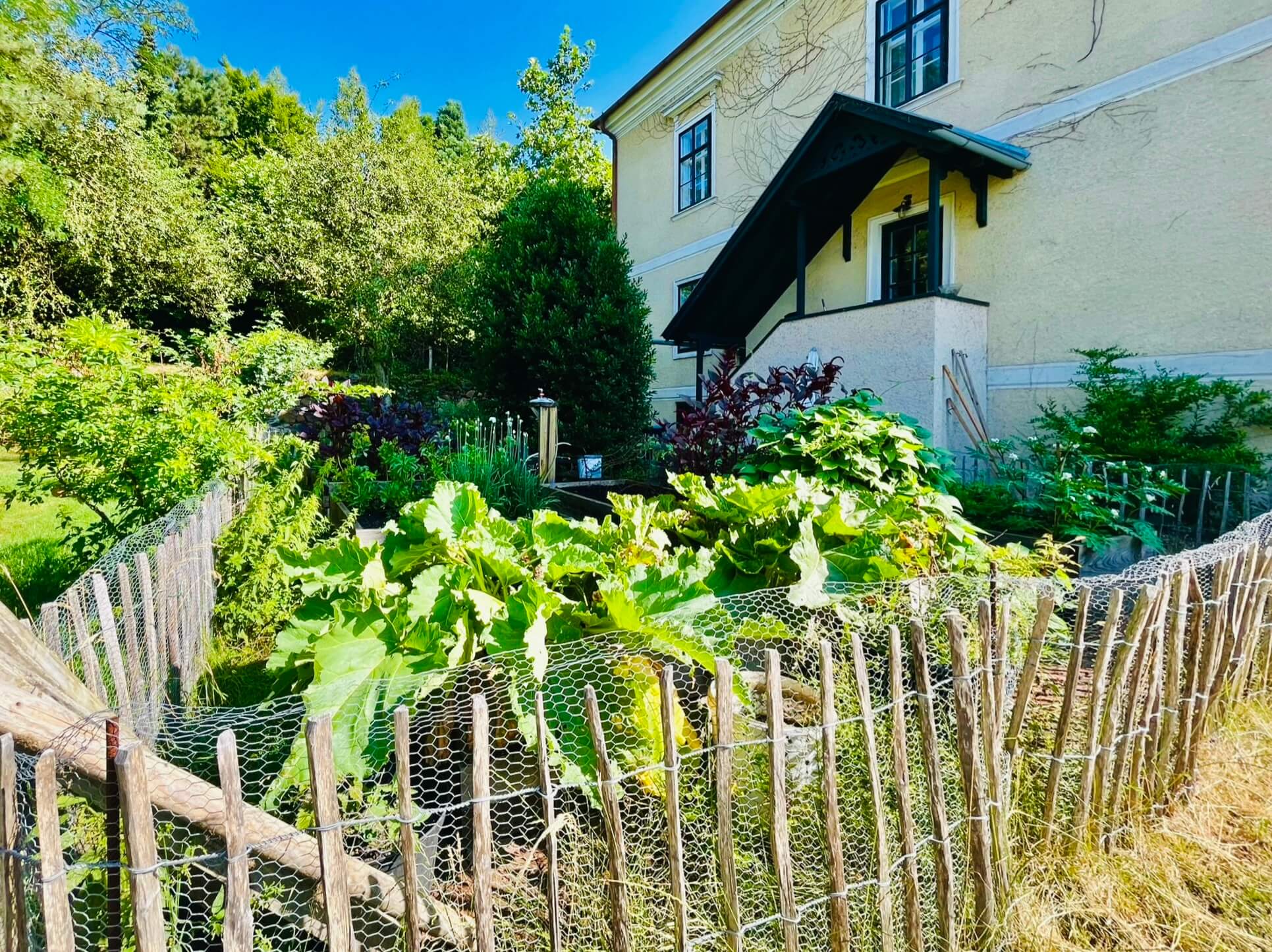 Die essbaren Landschaften und der Permakultur-Garten, durch deren Rabatte, Hochbeete und Obstbaum-Wiesen man streifen, und auch davon naschen darf, kultiviert 550 Obstbaum- & Strauch-Sorten, viele Kräuter und ausgezeichnete Gewürze.